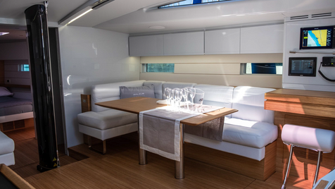 Below deck, elegant Italian design meets purposeful ergonomics. The interior combines warm wood finishes with minimalist accents, creating an atmosphere suited to both regatta layovers and extended cruises. Spacious cabins, a luminous saloon, and well-appointed galley showcase craftsmanship that enhances comfort without sacrificing weight or practicality.