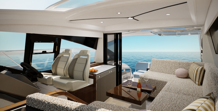 The interior introduces the premium décor collection from the new Targa 40 and Squadron 58, featuring reeded timber panels and sophisticated material selections.